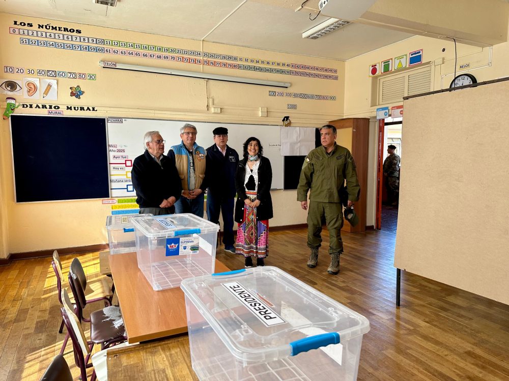 El delegado presidencial regional fue acompañado por el jefe de fuerzas general de Ejército Enrique Del Fierro y el presidente de la Junta Electoral de Coyhaique Jaime Álvarez, como también por la seremi de Gobierno Úrsula Mix, el seremi del Trabajo Rodrigo Díaz, el seremi de Justicia Samuel Navarro y el jefe de zona de Carabineros Eduardo Palma.