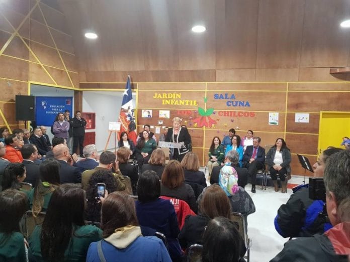 Tras recorrer las nuevas instalaciones, la máxima autoridad del país destacó la infraestructura de la Sala Cuna y jardín infantil “Los Chilcos”, en base a estructuras de perfiles de acero galvanizado. El interior es con encamizado de OSB y yeso cartón, mientras que su exterior es de encamizado OSB y tablas de bibra cemento. Además, tiene estuco térmico, ventanas termopanel, patios techados, sistema de losa radiante en su patio techado, además de radiadores en las otras dependencias del Jardín. Todo acorde a la normativa de aislación térmica para la zona (zona 7).