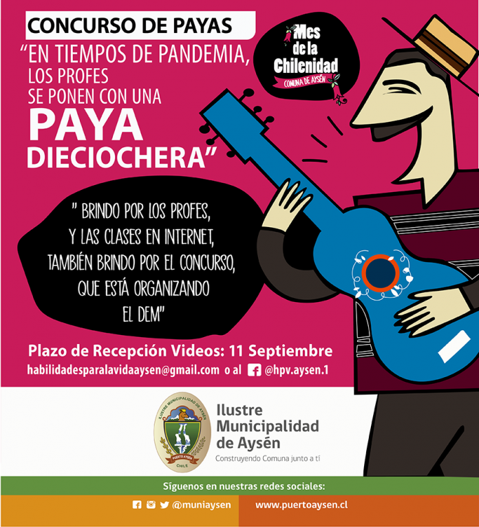 Con motivo iniciar las celebraciones del mes de la chilenidad, la Dirección de Educación (DEM Aysén) de la Ilustre Municipalidad de Aysén junto al Programa Habilidades para la Vida de Junaeb han elaborado un especial concurso de payas virtuales dirigido para los docentes de la comuna de Aysén. Esta instancia busca también contribuir al esparcimiento y recreación de los profesionales de la educación que han debido enfrentar una mayor carga laboral a raíz del nuevo escenario educativo del país en medio de la crisis sanitaria por covid-19. El plazo de recepción de videos para participar con las payas es hasta viernes 11 y los ganadores serán comunicados por las redes sociales municipales el día 25 del presente mes.