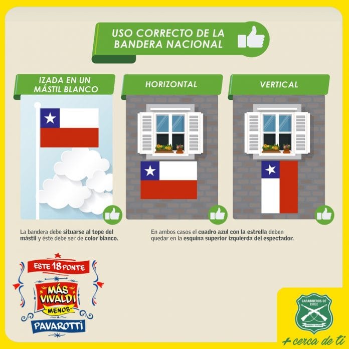 A pocas horas del inicio de Fiestas Patrias, Carabineros de Chile recuerda a la comunidad forma correcta de instalar el pabellón nacional, cuyo izamiento es obligatorio durante los días 18 y 19 de septiembre.