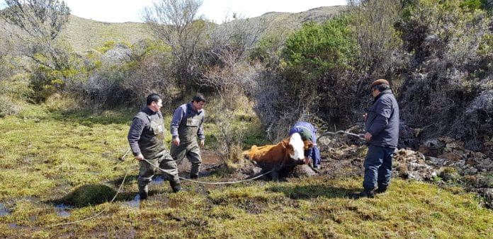 Carabineros de la Tenencia de Puerto Ibáñez (F) junto a lugareños rescatan a vacuno atrapado en humedal