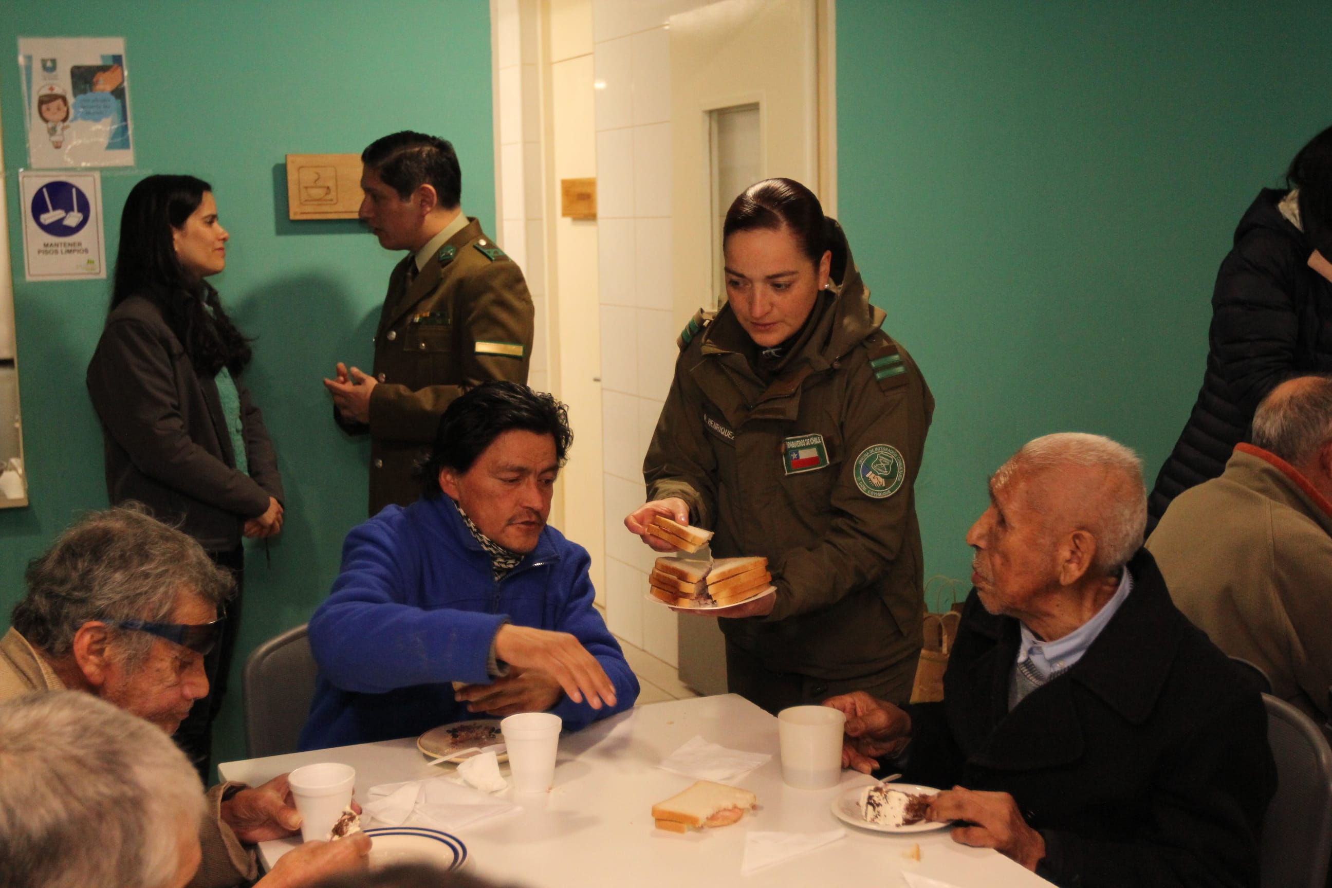 “Hicimos entrega de un kit que contiene una parka, un pantalón, un jersey, una polera y una camisa para cada usuario. No olvidemos que esta una zona de bajas temperaturas y nuestra preocupación como Carabineros, es Abrigar a un Amigo”, expresó.